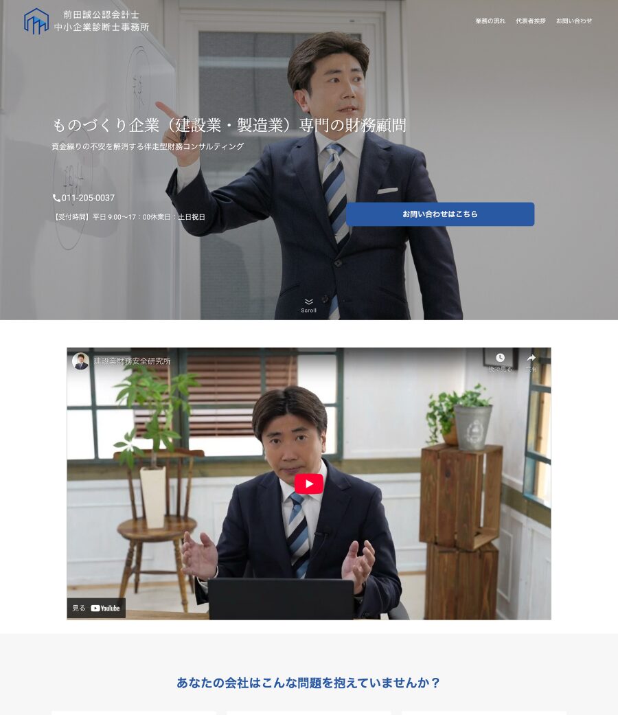 本サイトは、公認会計士・中小企業診断士として中小企業の経営支援を行う事務所様の専門性を、誠実かつ信頼感のある印象で伝えることを目的に制作しました。主なターゲットは、経営課題を抱える中小企業の経営者層であり、「誰に相談すればいいかわからない」と感じている方が、安心して最初の一歩を踏み出せるような構成とトーンを意識しています。