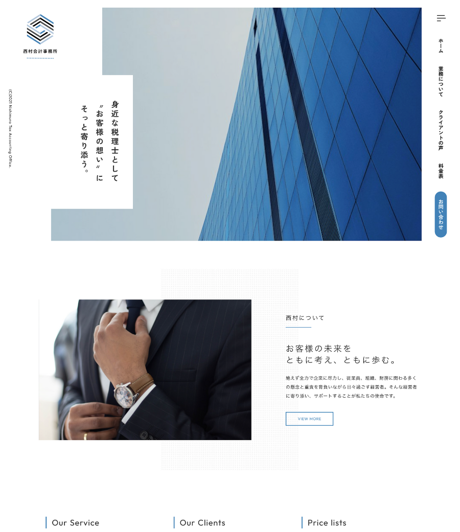 本サイトは、シンプルで無駄のない構成を基本としつつ、適度なアニメーションやレイアウトの動きを取り入れることで、堅実さだけでなく現代的でスタイリッシュな印象を持たせています。落ち着いた配色と余白設計により、会計事務所としての信頼性や清潔感をしっかりと表現しています。