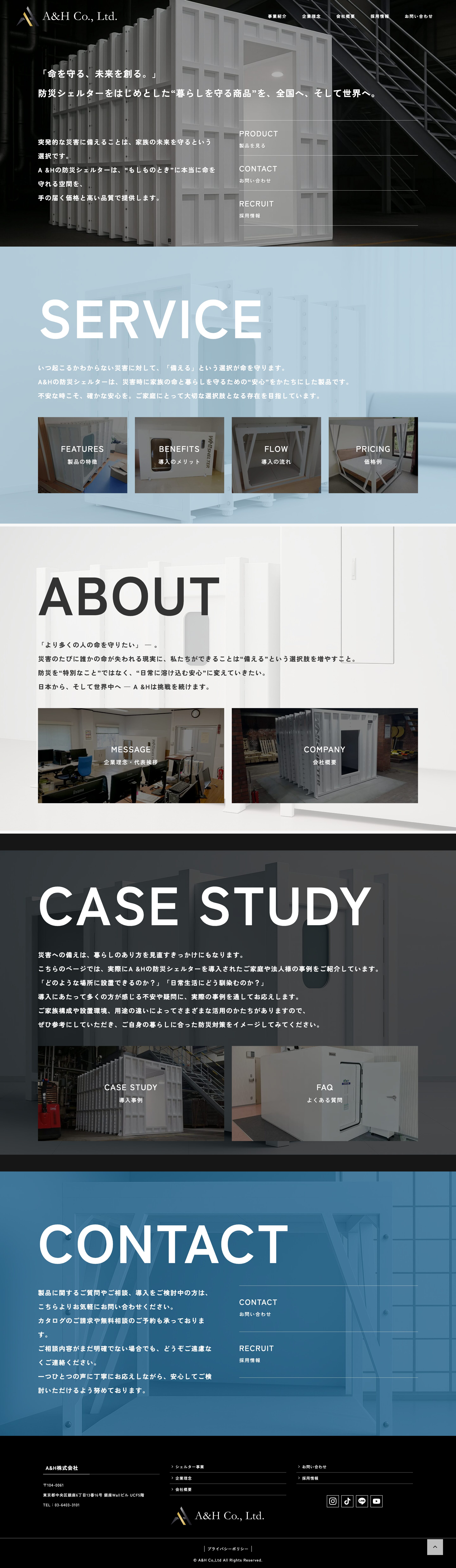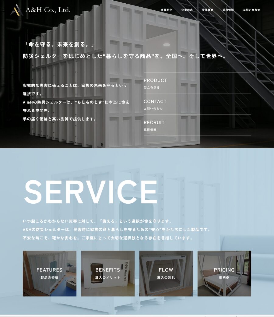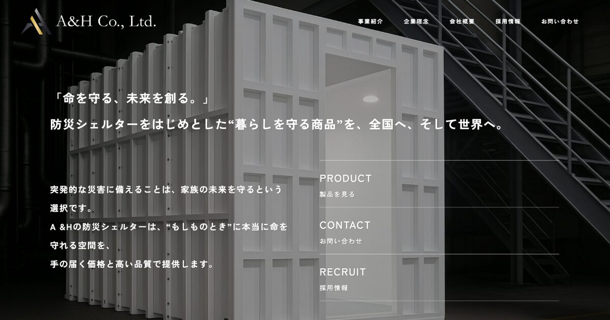 本サイトは、防災シェルター事業を展開するA&H株式会社のコーポレートサイトとして、実案件で納品した制作例です。WordPressテーマ「SWELL」をベースにカスタマイズし、黒を基調としたスタイリッシュなデザインで「命を守る」という事業テーマを強さと洗練の両面から表現しました。防災関連サイトにありがちな無機質さを避け、信頼感・先進性・高級感のバランスを意識しています。