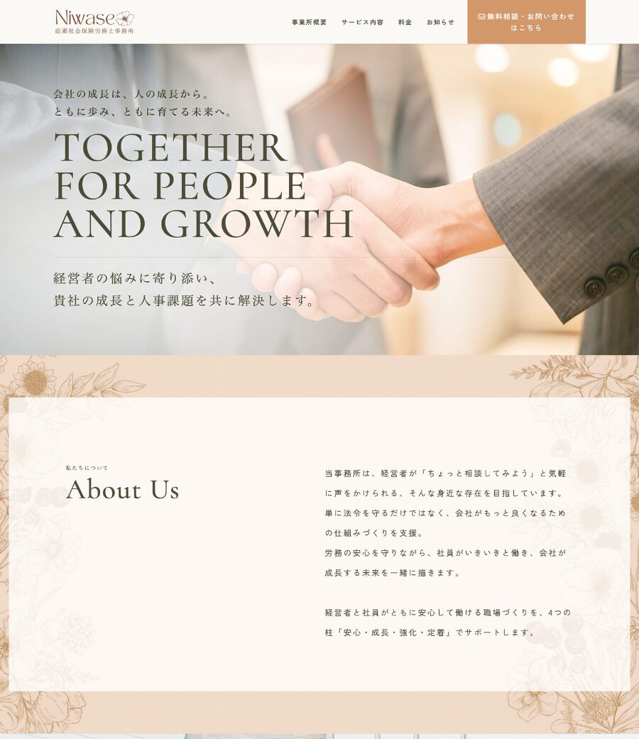 視覚面では、植物のイラストや柔らかな雰囲気の写真を要所に配置し、労務サポートに対する「寄り添い」や「あたたかさ」が自然に感じられるよう工夫しています。専門分野のサイトでありながらも堅苦しくならず、訪れた人が安心して相談できる印象を持てるよう、全体の表情をやさしく統一しました。